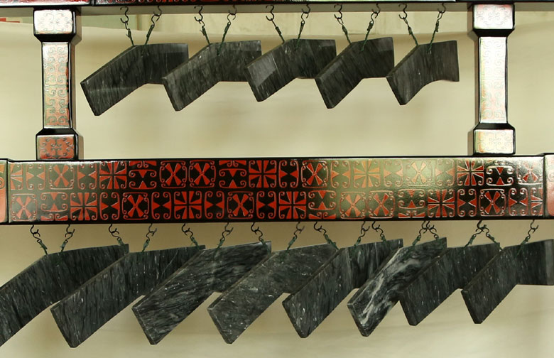 簡介:12件編鐘分2層排列,上6件下6件,編鐘為青銅鑄造,樣式可選,有長枚甬鐘、短枚甬鐘、滿花紋甬鐘、有紋鈕鐘和無紋鈕鐘等多種鐘型,承托編鐘的木架采用高密度板加工,表面噴繪仿古紋飾。配套有演奏工具、收藏證書等附件。