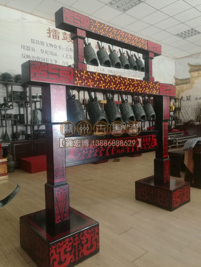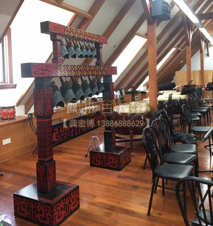 上??蛻舳ㄖ频?2件編鐘長(zhǎng)2米、高2米、寬0.55米,分兩層懸掛了12件青銅編鐘,每件編鐘均可發(fā)出2個(gè)不同的樂音,半音齊備,采用A=440Hz標(biāo)準(zhǔn)調(diào)音,適合小型民樂團(tuán)體使用,豐富了民樂團(tuán)的整體音樂效果,從而獲得客戶的一致好評(píng)。